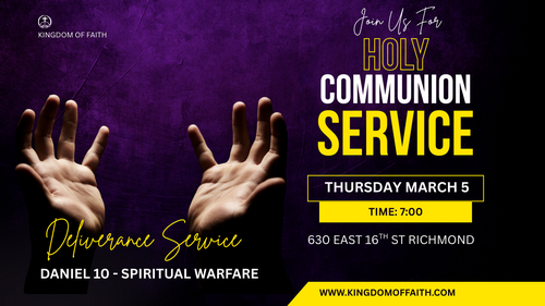 Kingdom of Faith is a new COGIC ministry in Richmond where people can meet Jesus, learn the authority of the Kingdom and engage in a culture of faith in God. Everyone is welcome! We believe in creating a space where people can have authentic encounters with Christ, discover their gifts and use them for God's glory. Our services are held on Thursdays at 7pm!